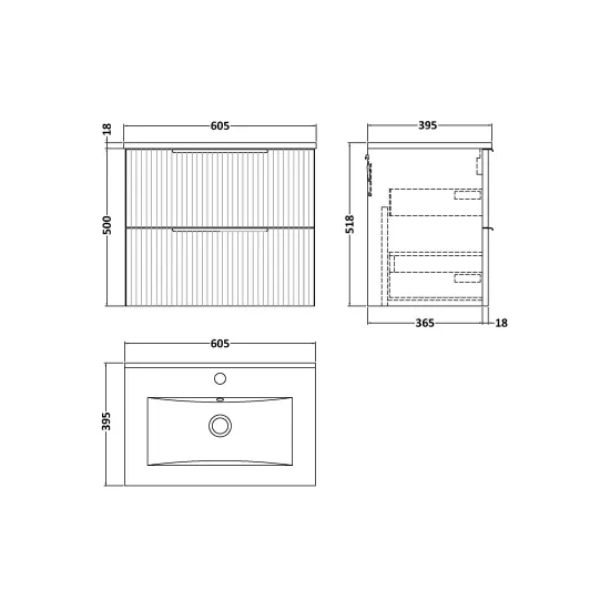 Hudson Reed Fluted 600mm Wall Hung 2-Drawer Vanity and Minimalist Basin - Satin White