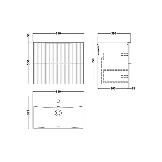 Hudson Reed Fluted 600mm Wall Hung 2-Drawer Vanity and Thin-Edge Basin - Satin Green