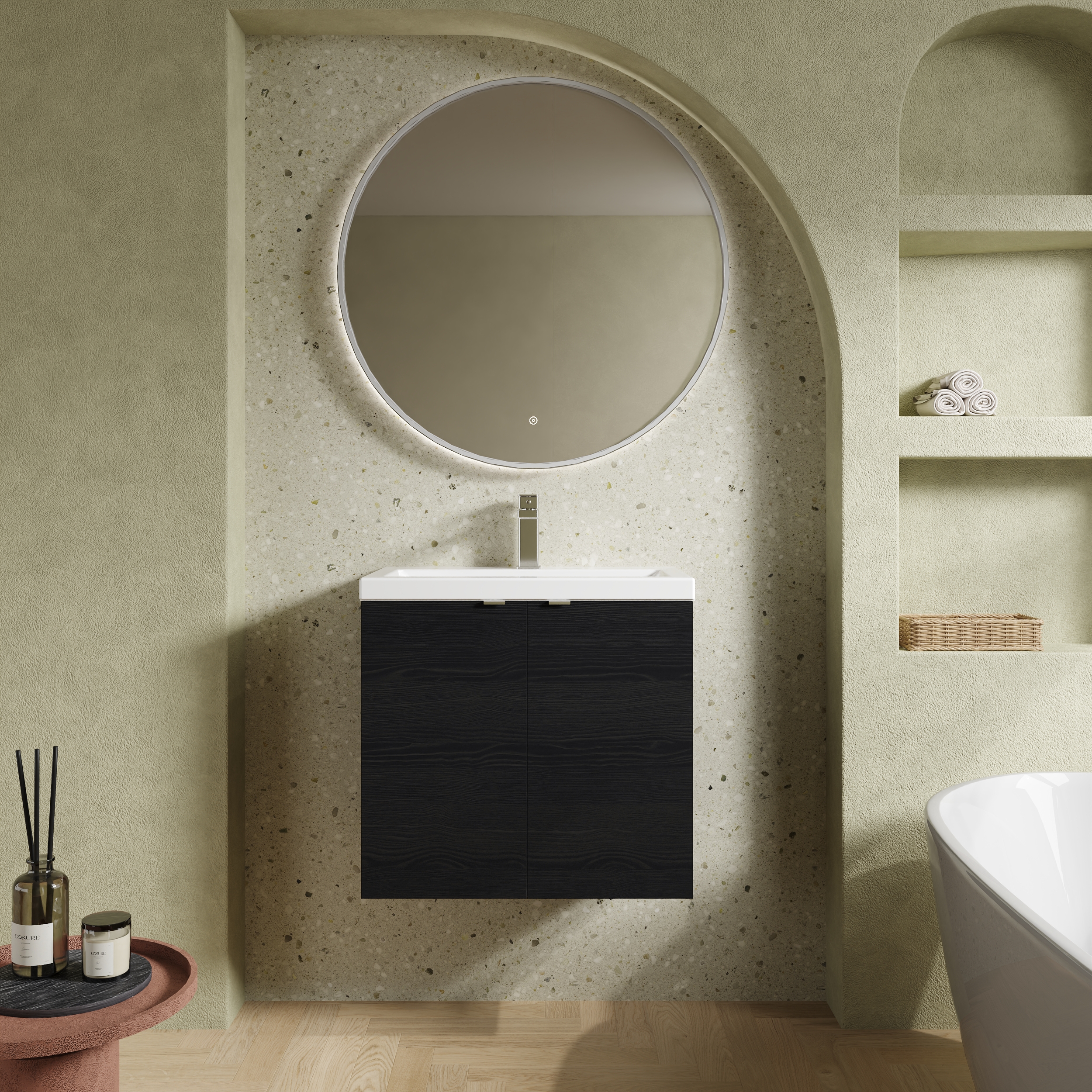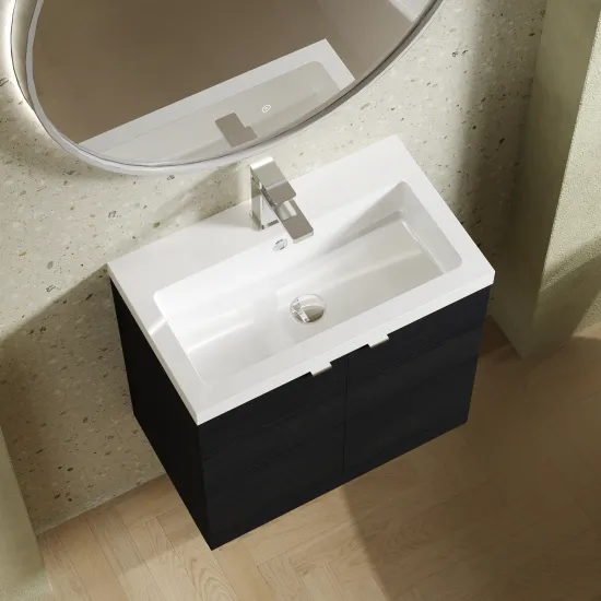 The strking effect of this Charcoal Black unit creates seamless contrast with our range of polymarble basins.