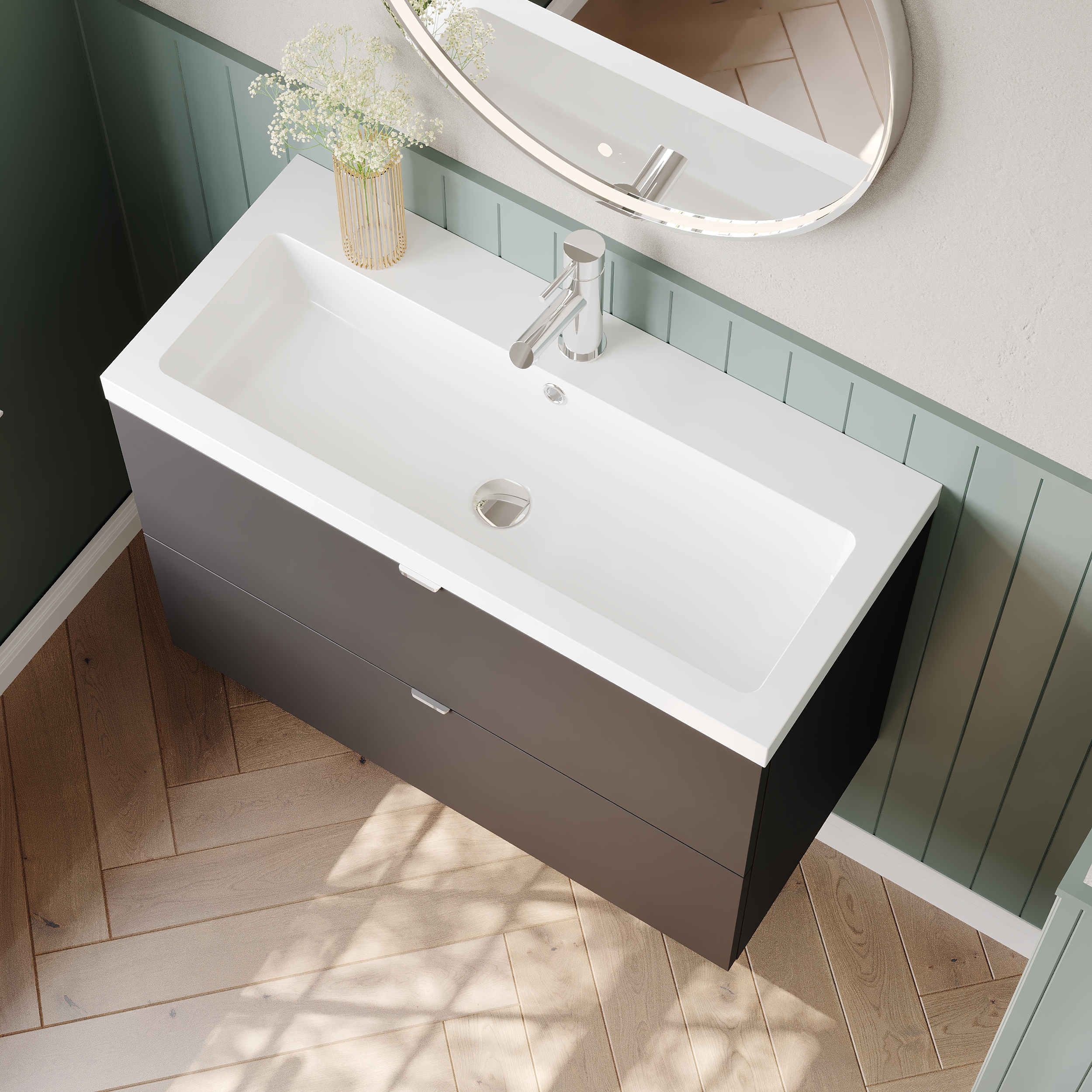 The strking effect of this gloss grey unit creates seamless contrast with our range of polymarble basins.