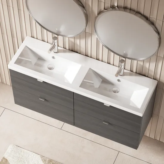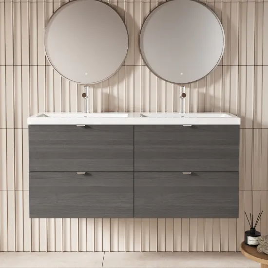 Hudson Reed Fusion Wall Hung 4 Drawer Vanity Unit & Twin Ceramic Basin 1200mm - Anthracite Woodgrain