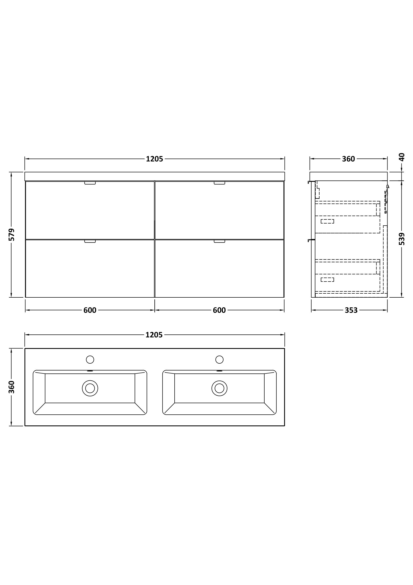 Hudson Reed Fusion 1200mm Wall Hung 4 Drawer Vanity Unit With Twin Polymarble Basin