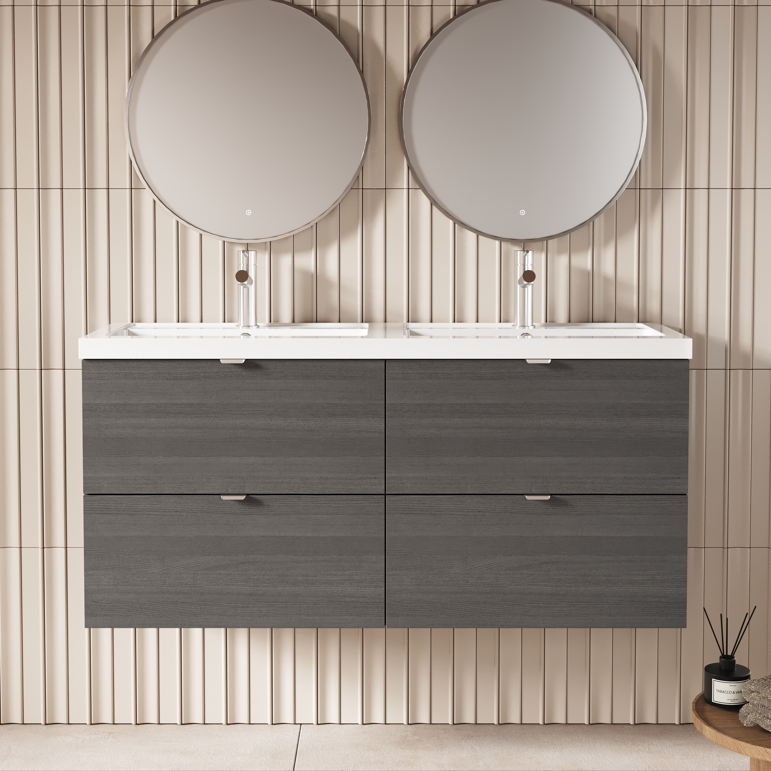 Hudson Reed Fusion Wall Hung 4 Drawer Vanity Unit & Twin Polymarble Basin 1200mm - Anthracite Woodgrain