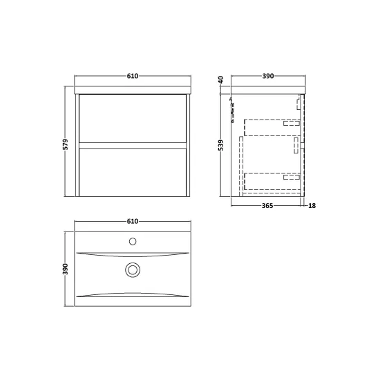 Nuie Havana 610mm 2 Drawer Wall Hung Vanity Unit With Mid-Edge Ceramic Basin