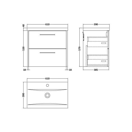 Hudson Reed Juno 600mm Wall Hung 2 Drawer Vanity Unit Including Curved Ceramic Basin