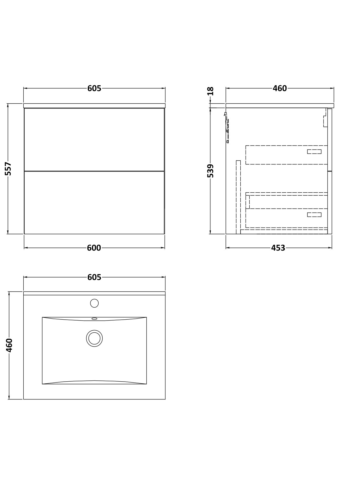 nuie Lux Kivo 600mm 2- Drawer Wall Hung Unit with a 1 Tap Hole Minimalist Basin Top - Autumn Oak