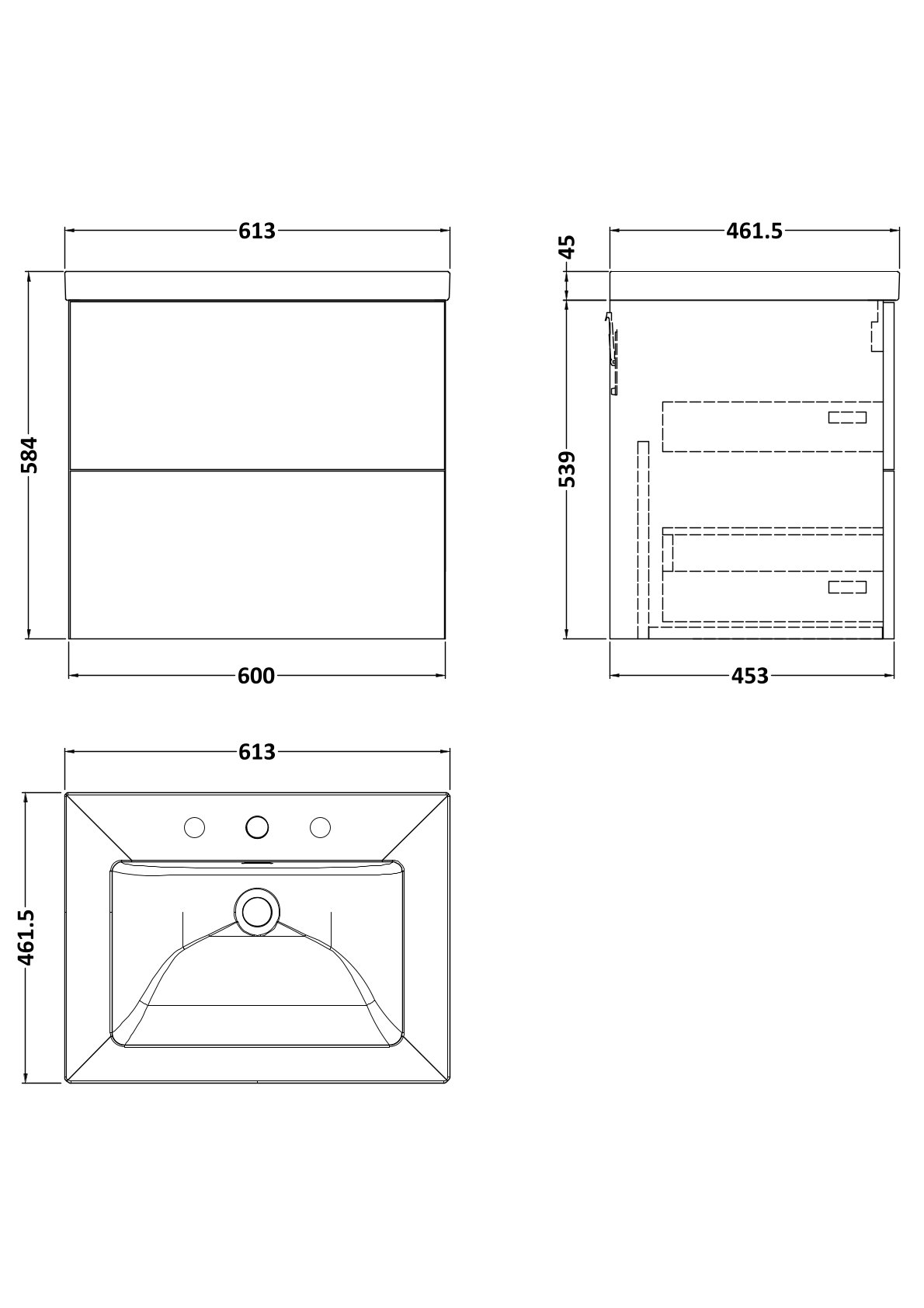 Kivo 600mm 2- Drawer Wall Hung Unit with a Contemporary Basin - 3 Tap Holes