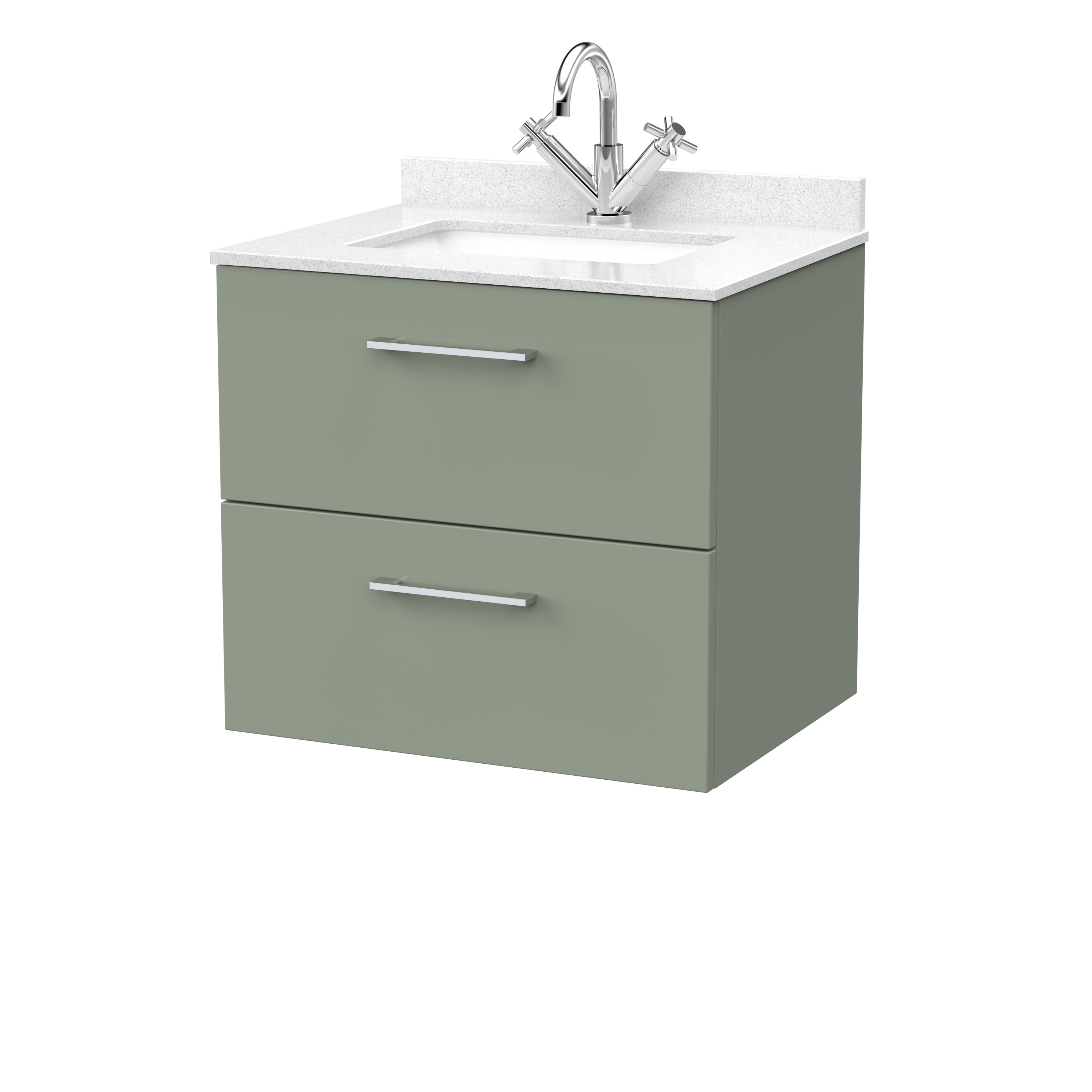 nuie Lux Kivo 600mm 2- Drawer Wall Hung Unit with a Single Bowl Marble Top 1 Tap Hole in White - Fern Green