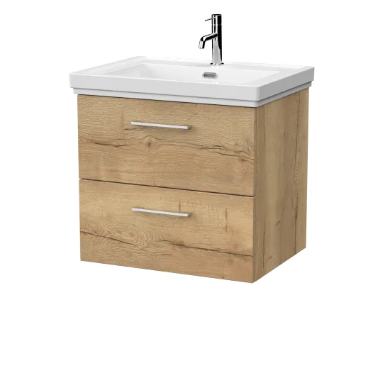 nuie Lux Kivo 600mm 2- Drawer Wall Hung Unit with a Traditional Fireclay Basin - 1 Tap Hole - Autumn Oak