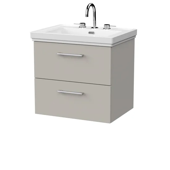 nuie Lux Kivo 600mm 2- Drawer Wall Hung Unit with a Traditional Fireclay Basin - 3 Tap Holes - Pebble Grey