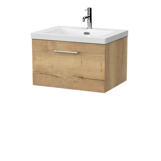 nuie Lux Kivo 600mm Single Drawer Wall Hung Unit with a Contemporary Basin - 1 Tap Hole - Autumn Oak