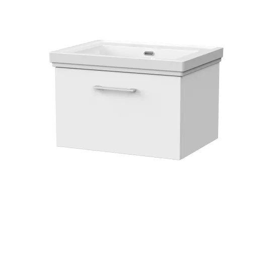 nuie Lux Kivo 600mm Single Drawer Wall Hung Unit with a Traditional Fireclay Basin - 0 Tap Holes - Matt White