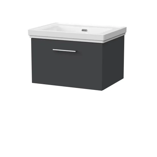 nuie Lux Kivo 600mm Single Drawer Wall Hung Unit with a Traditional Fireclay Basin - 0 Tap Holes - Soft Black