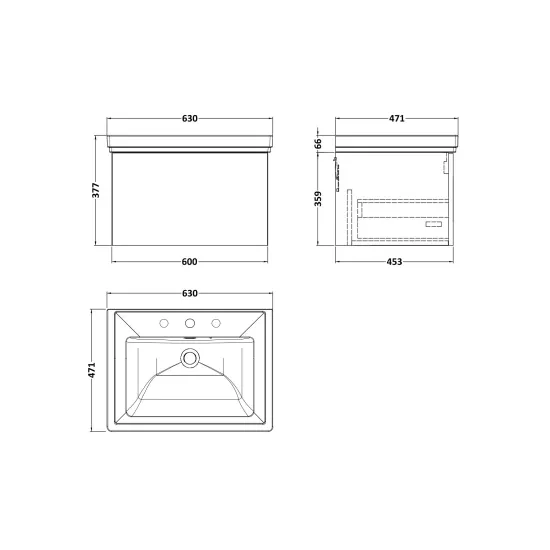 Kivo 600mm Single Drawer Wall Hung Unit with a Traditional Fireclay Basin - 3 Tap Holes