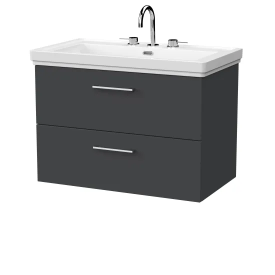 nuie Lux Kivo 800mm 2- Drawer Wall Hung Unit with a Traditional Fireclay Basin - 3 Tap Holes - Soft Black