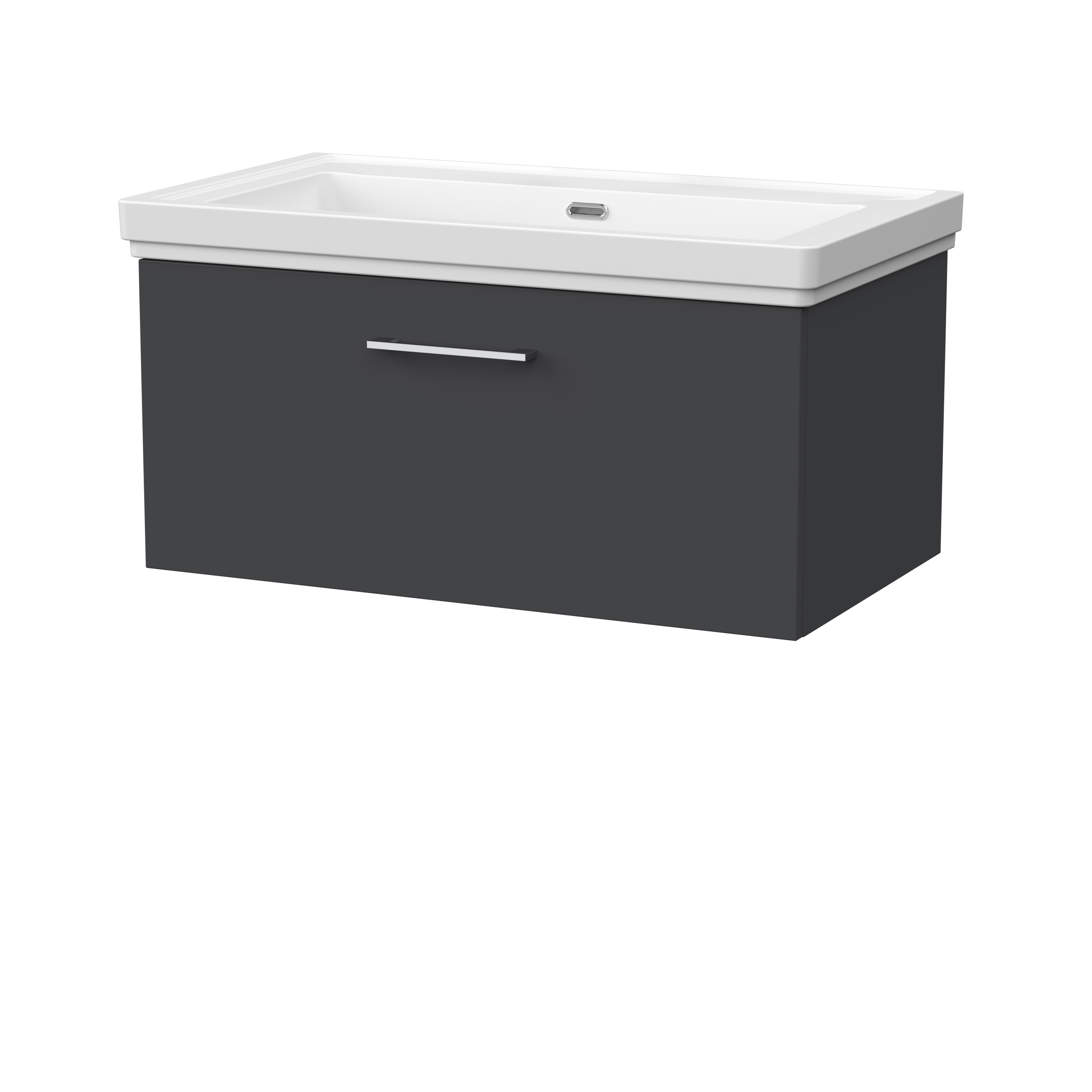 nuie Lux Kivo 800mm Single Drawer Wall Hung Unit with a Traditional Fireclay Basin - 0 Tap Holes - Soft Black