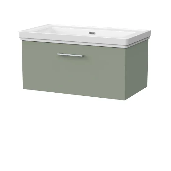 nuie Lux Kivo 800mm Single Drawer Wall Hung Unit with a Traditional Fireclay Basin - 0 Tap Holes - Fern Green