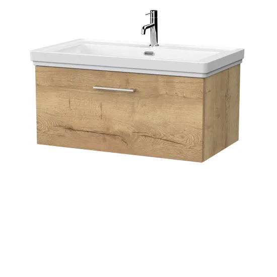 nuie Lux Kivo 800mm Single Drawer Wall Hung Unit with a Traditional Fireclay Basin - 1 Tap Hole - Autumn Oak