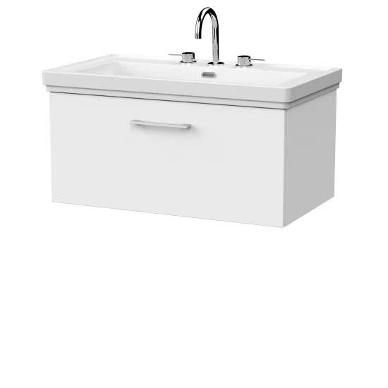 nuie Lux Kivo 800mm Single Drawer Wall Hung Unit with a Traditional Fireclay Basin - 3 Tap Holes - Matt White