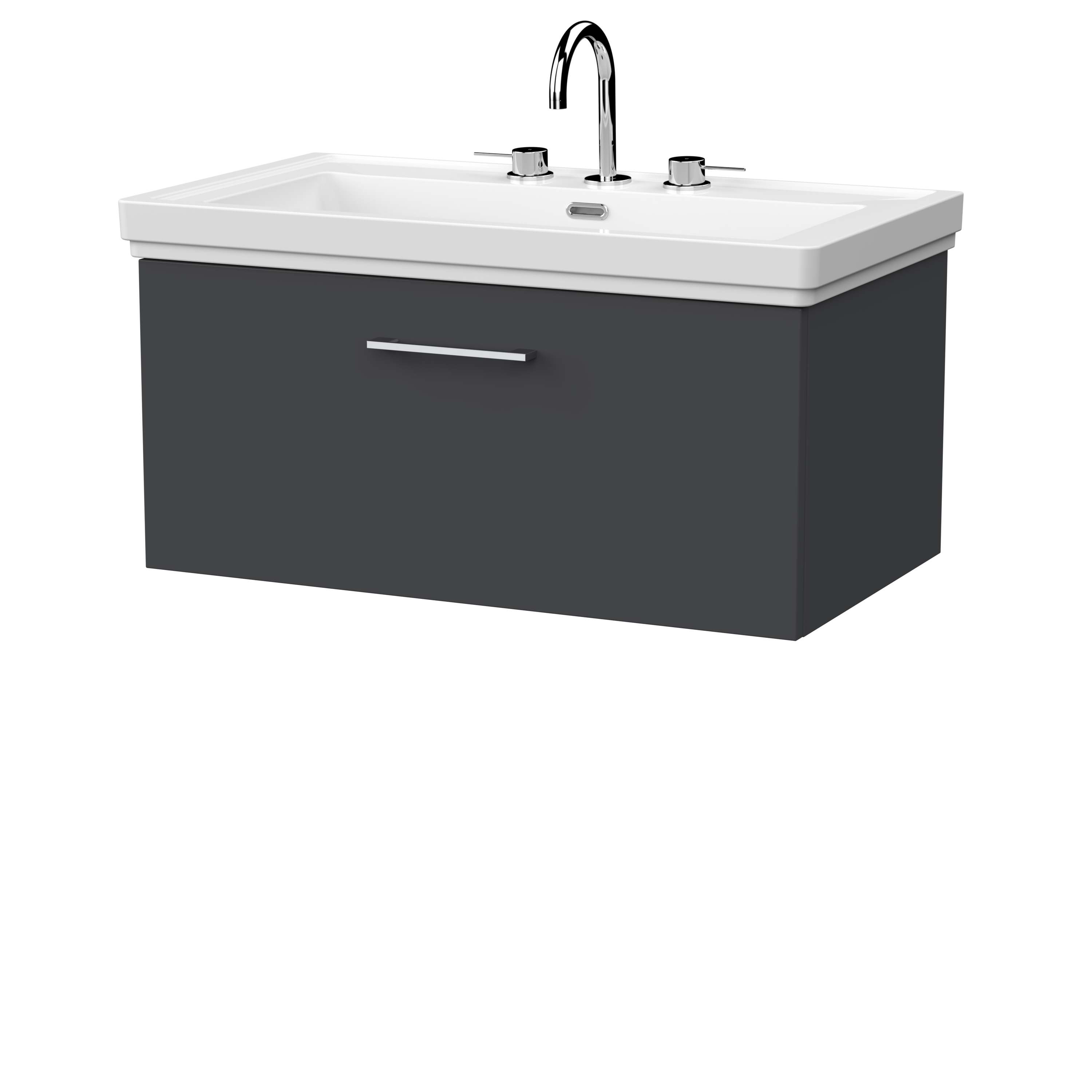 nuie Lux Kivo 800mm Single Drawer Wall Hung Unit with a Traditional Fireclay Basin - 3 Tap Holes - Soft Black