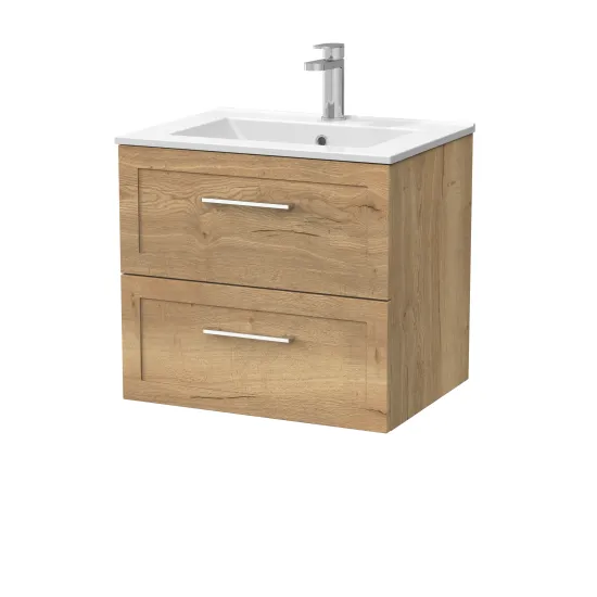 nuie Lux Larck 600mm 2- Drawer Wall Hung Unit with 1 Tap Hole Minimalist Basin Top - Autumn Oak