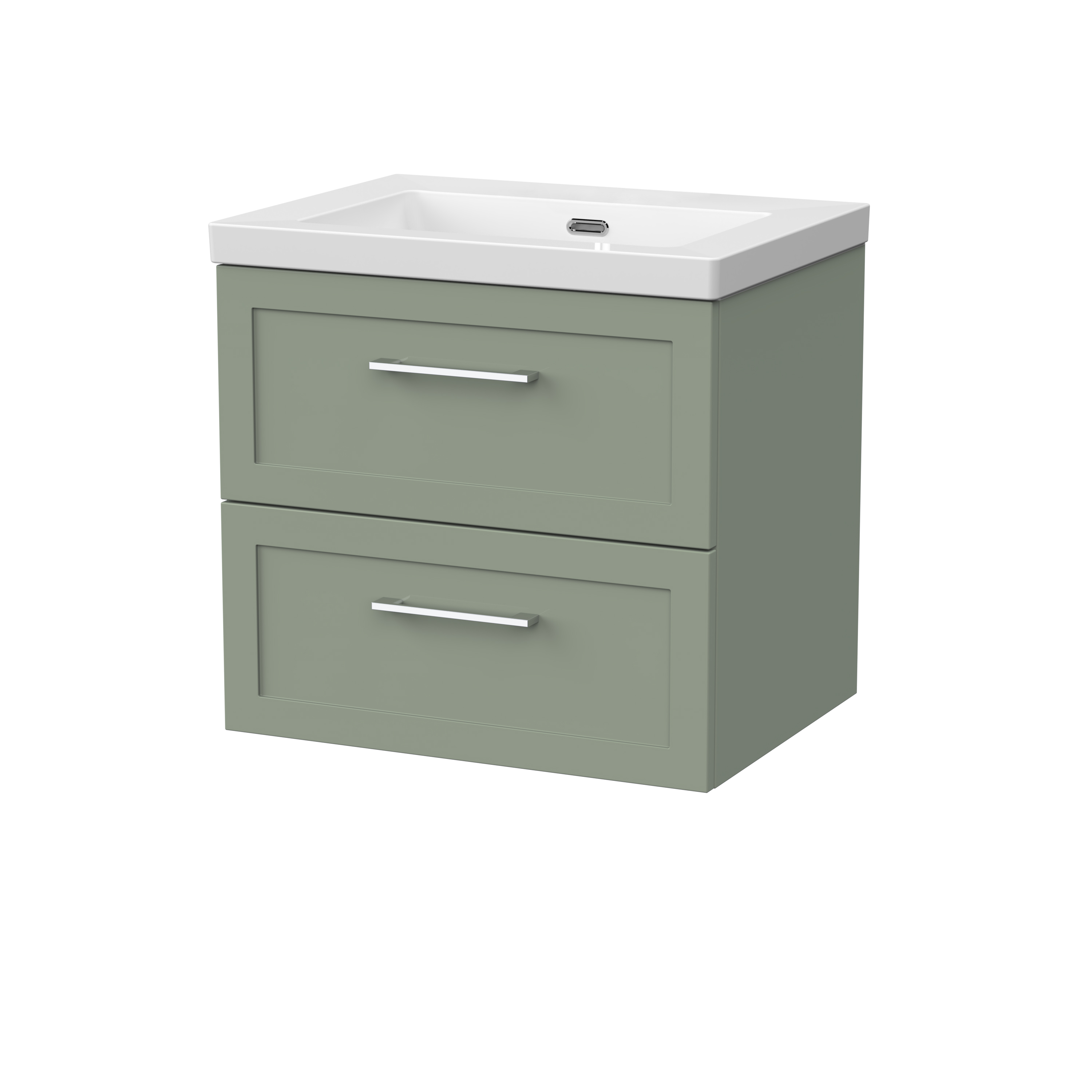 nuie Lux Larck 600mm 2- Drawer Wall Hung Unit with Contemporary Fireclay Basin - 0 Tap Holes - Fern Green