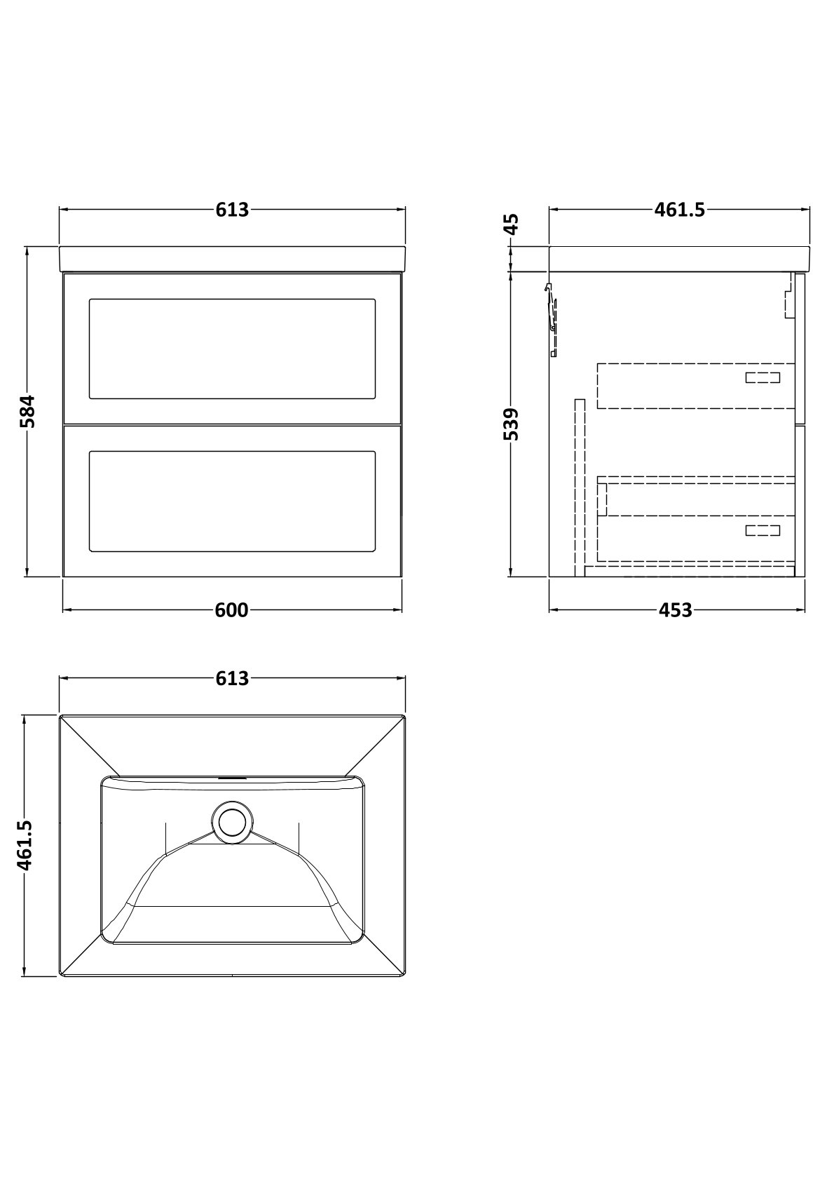 Larck 600mm 2- Drawer Wall Hung Unit with Contemporary Fireclay Basin - 0 Tap Holes