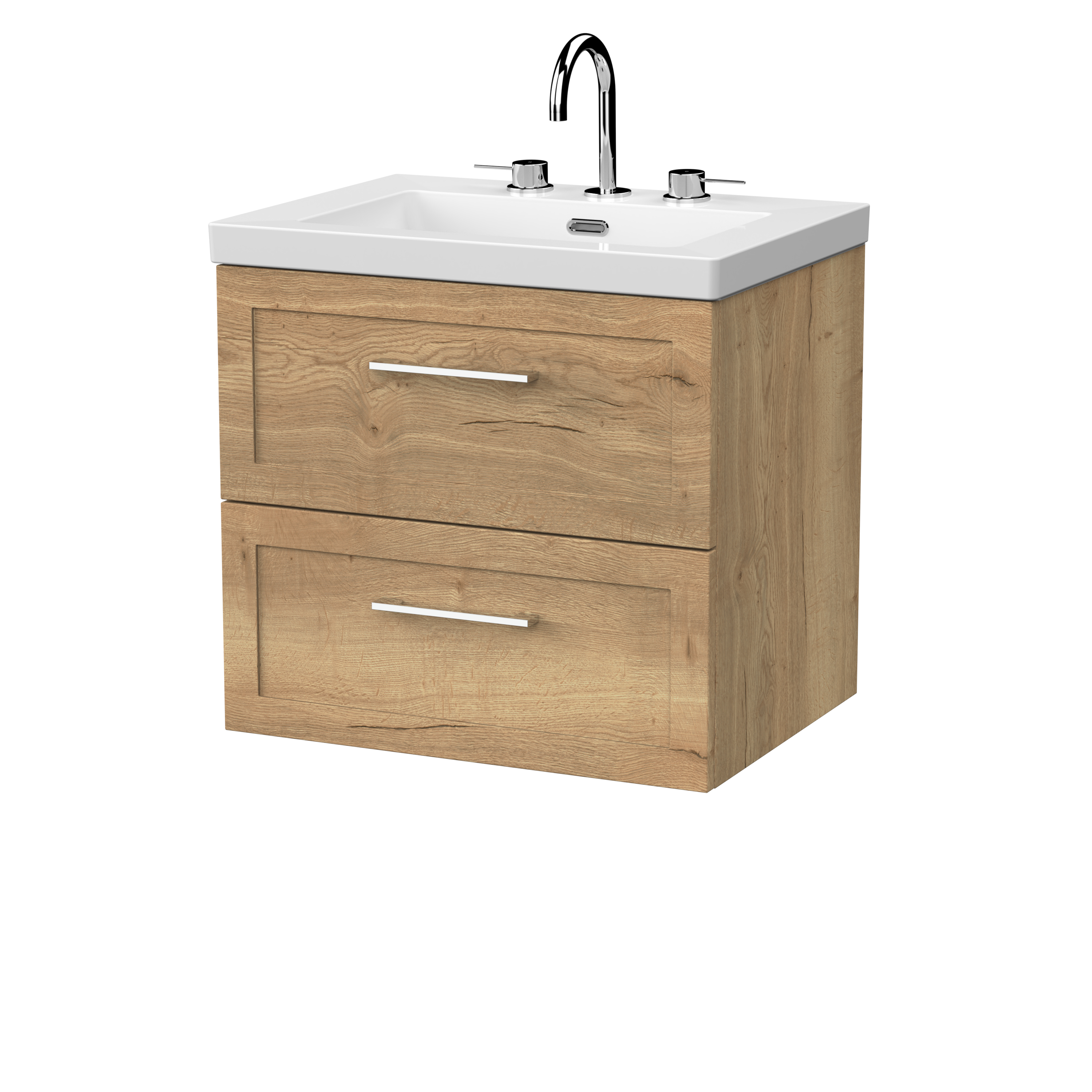 nuie Lux Larck 600mm 2- Drawer Wall Hung Unit with Contemporary Fireclay Basin - 3 Tap Holes - Autumn Oak