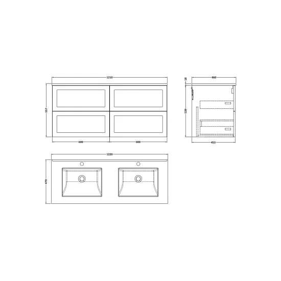 Complete with a traditionally styled marble top basin with twin square bowls.