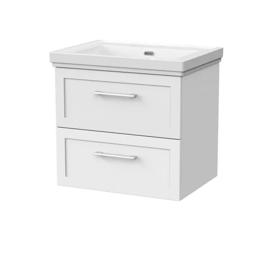 nuie Lux Larck 600mm 2- Drawer Wall Hung Unit with Traditional Fireclay Basin - 0 Tap Holes - Matt White