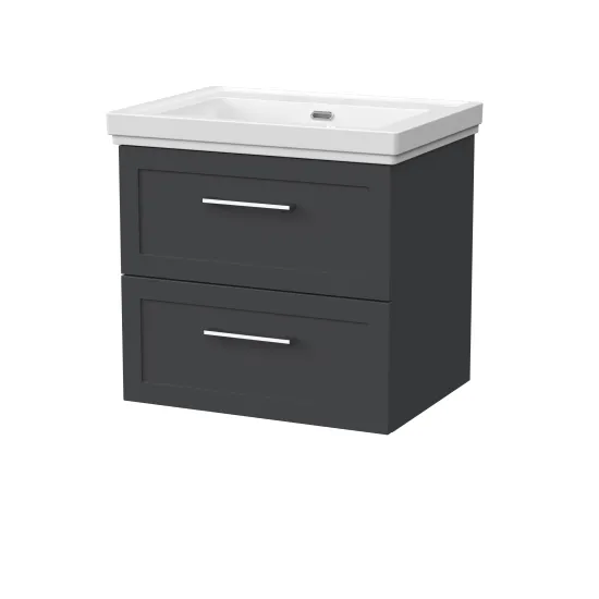 nuie Lux Larck 600mm 2- Drawer Wall Hung Unit with Traditional Fireclay Basin - 0 Tap Holes - Soft Black