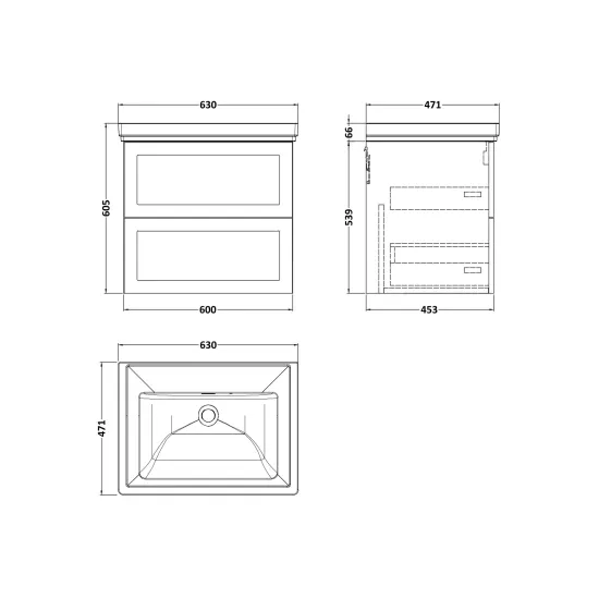 Larck 600mm 2- Drawer Wall Hung Unit with Traditional Fireclay Basin - 0 Tap Holes