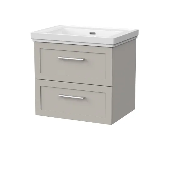 nuie Lux Larck 600mm 2- Drawer Wall Hung Unit with Traditional Fireclay Basin - 0 Tap Holes - Pebble Grey