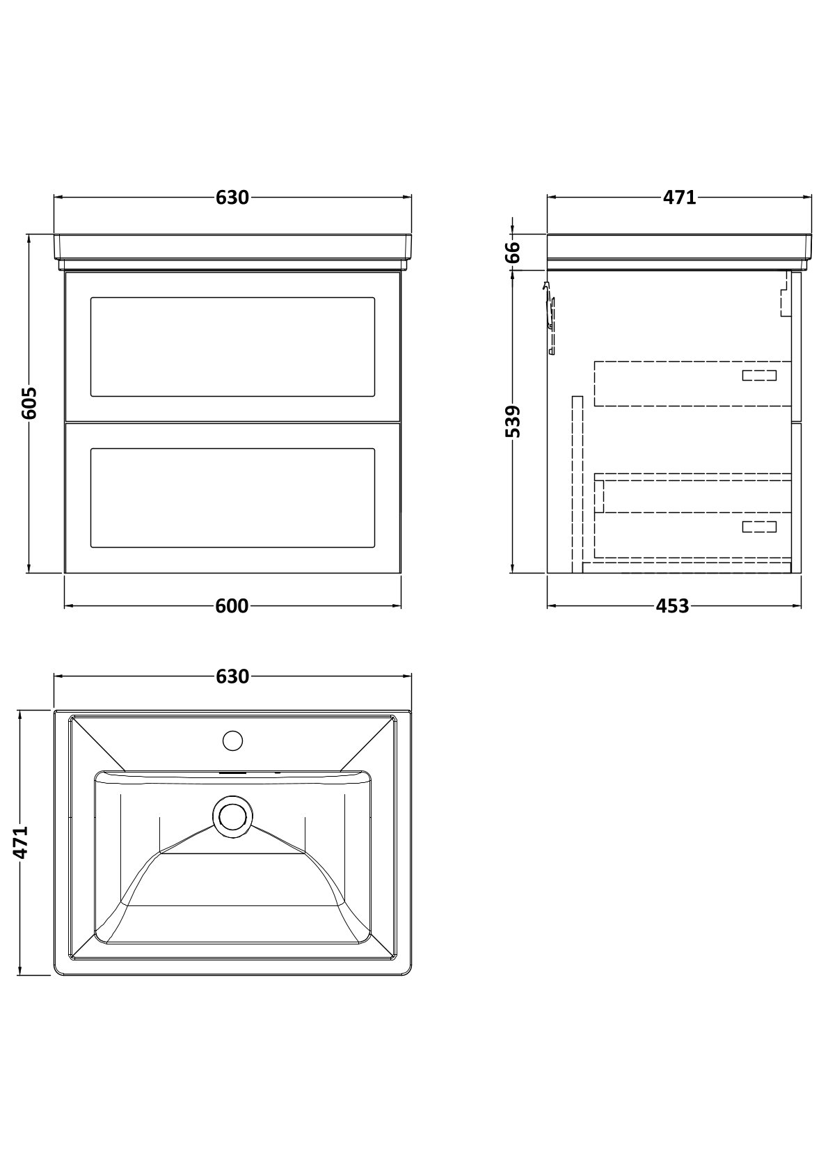 Larck 600mm 2- Drawer Wall Hung Unit with Traditional Fireclay Basin - 1 Tap Hole