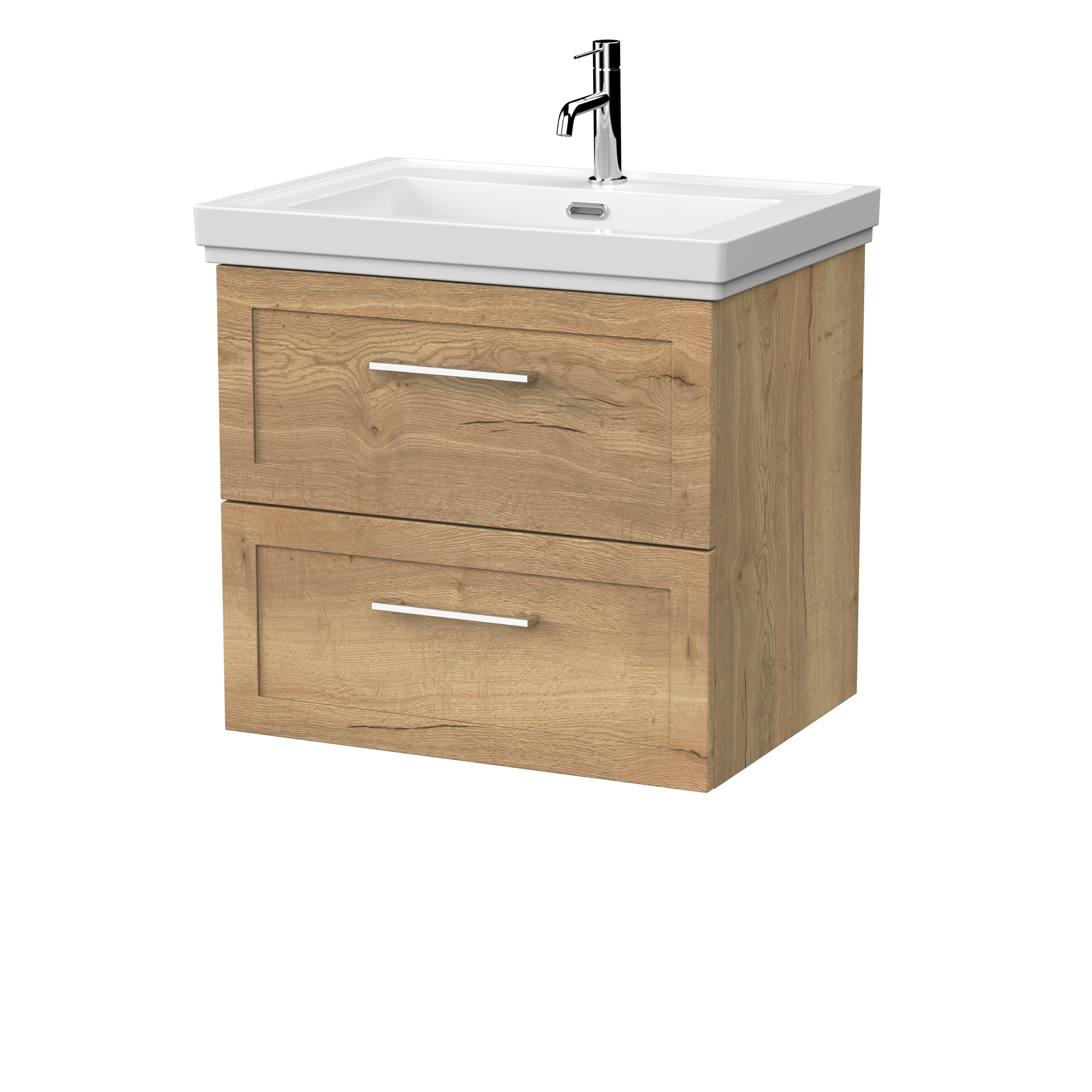 nuie Lux Larck 600mm 2- Drawer Wall Hung Unit with Traditional Fireclay Basin - 1 Tap Hole - Autumn Oak