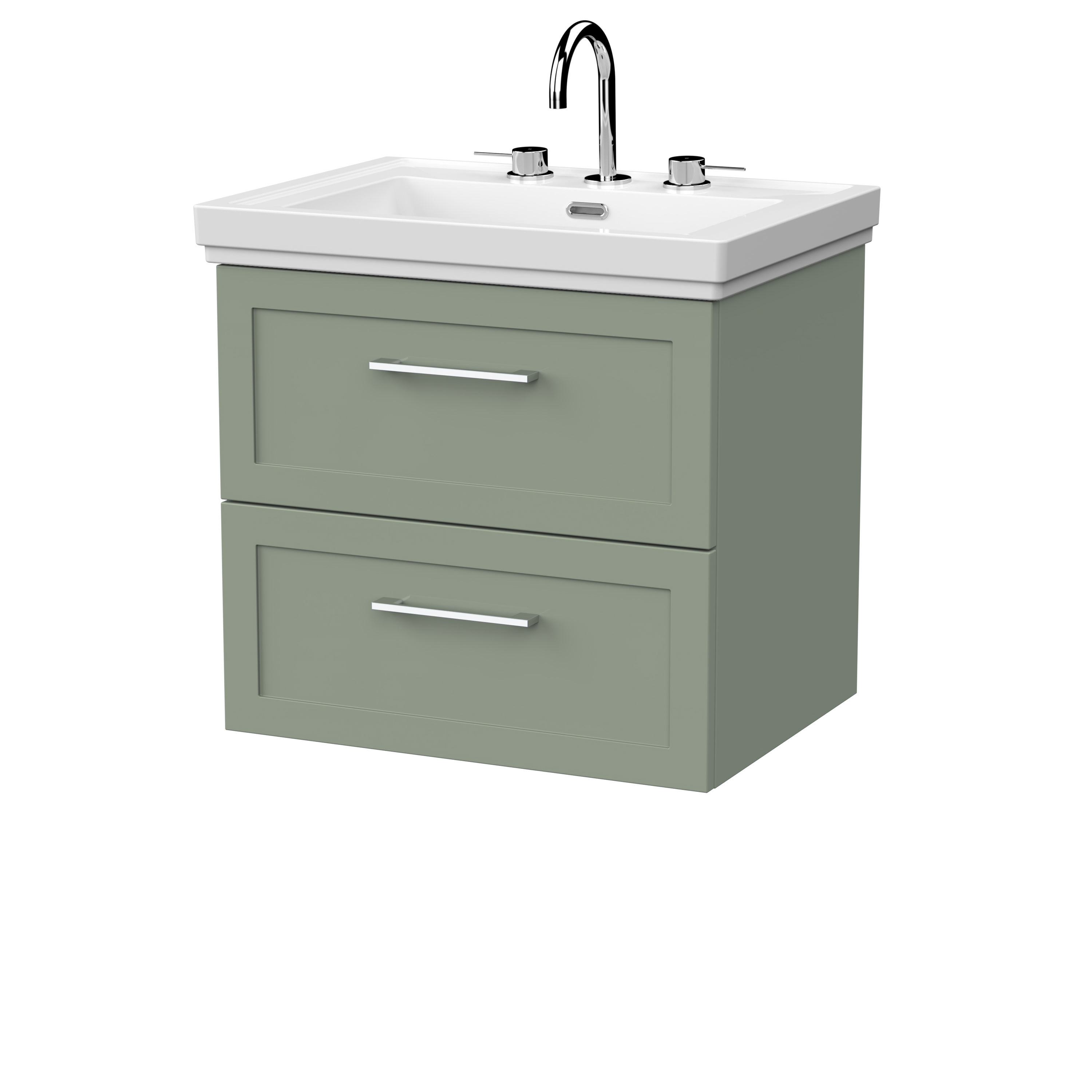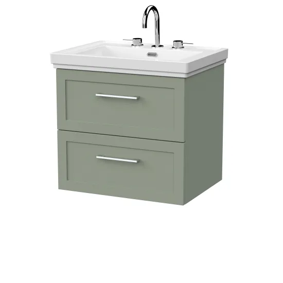 nuie Lux Larck 600mm 2- Drawer Wall Hung Unit with Traditional Fireclay Basin - 3 Tap Holes - Fern Green
