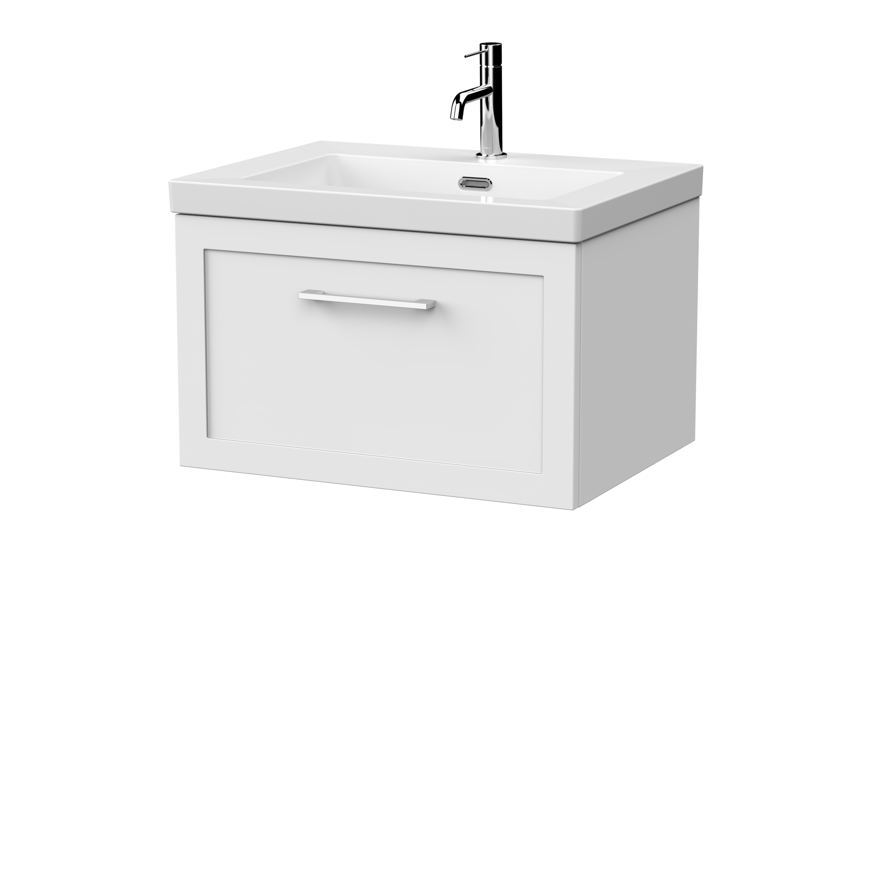nuie Lux Larck 600mm Single Drawer Wall Hung Unit with Contemporary Fireclay Basin - 1 Tap Hole - Matt White