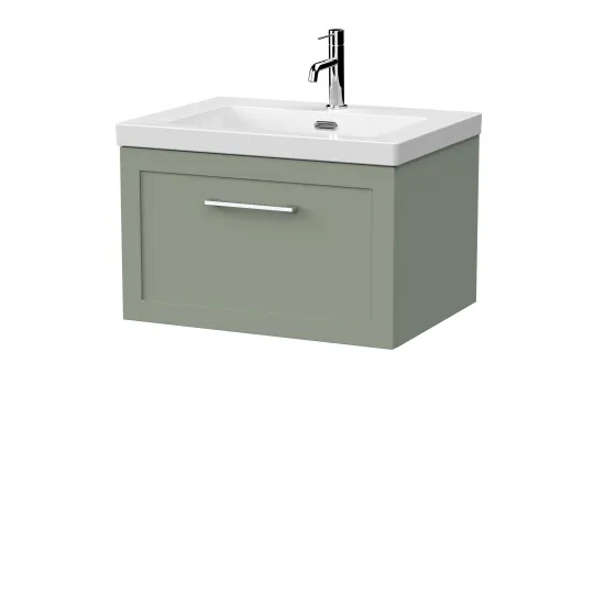 nuie Lux Larck 600mm Single Drawer Wall Hung Unit with Contemporary Fireclay Basin - 1 Tap Hole - Fern Green