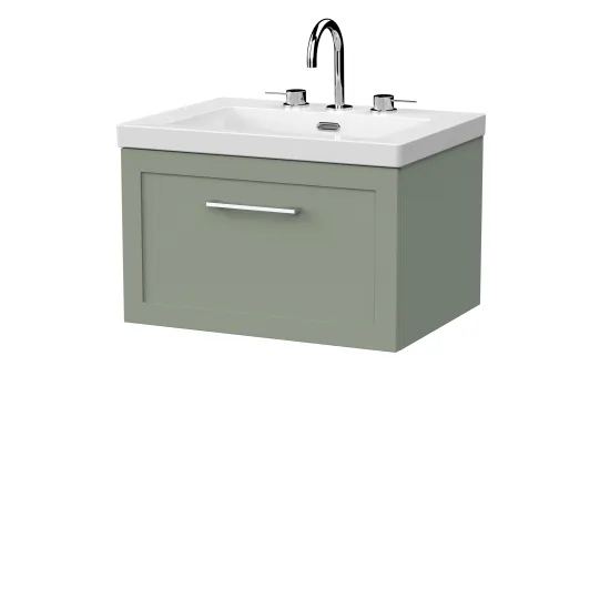 nuie Lux Larck 600mm Single Drawer Wall Hung Unit with Contemporary Fireclay Basin - 3 Tap Holes - Fern Green