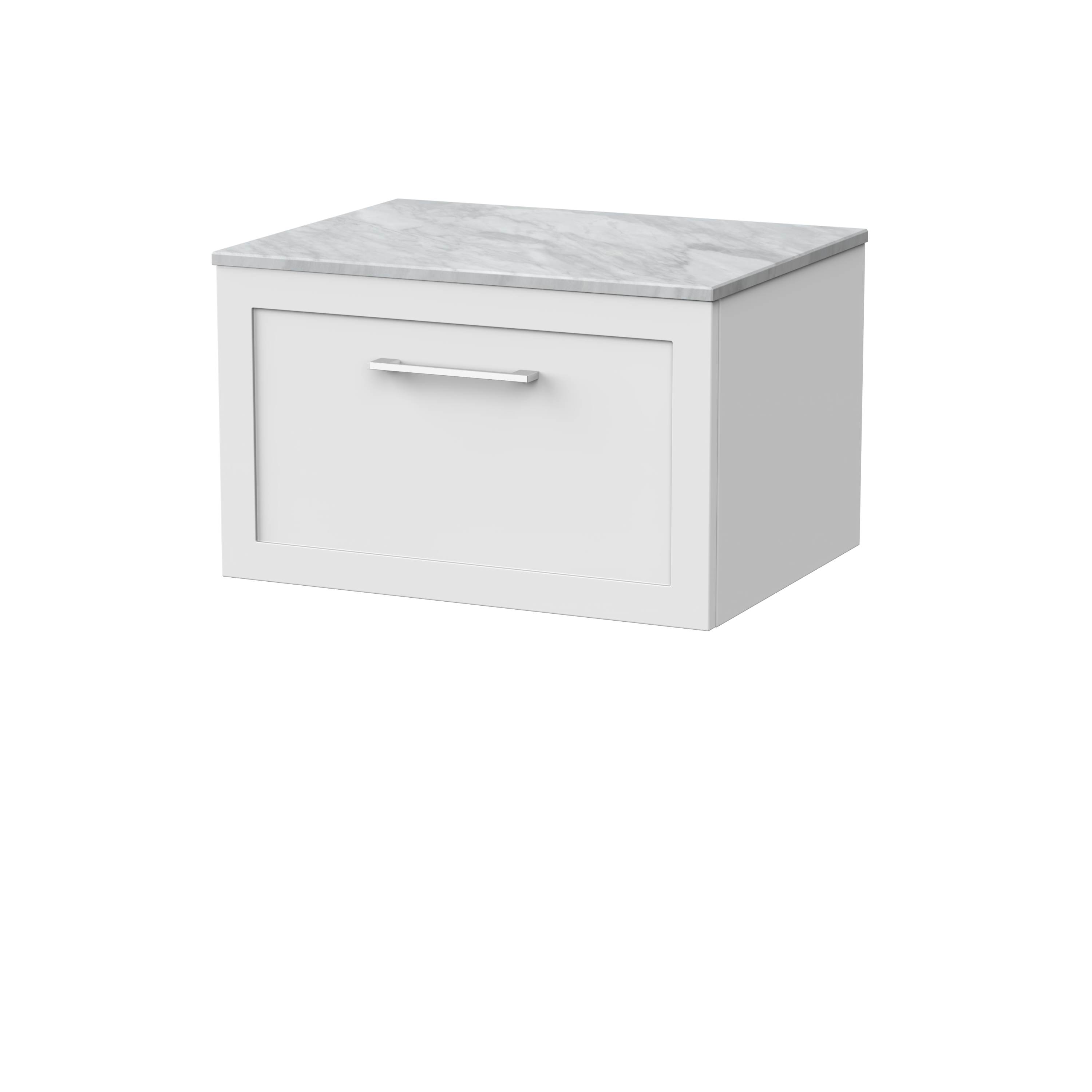 nuie Lux Larck 600mm Single Drawer Wall Hung Unit with Grey Marble Top - Matt White