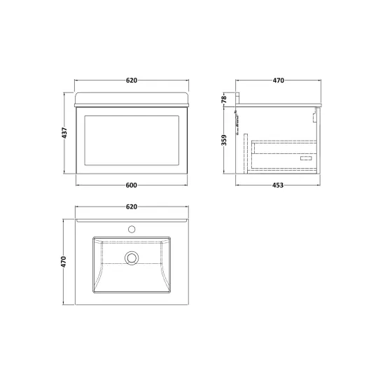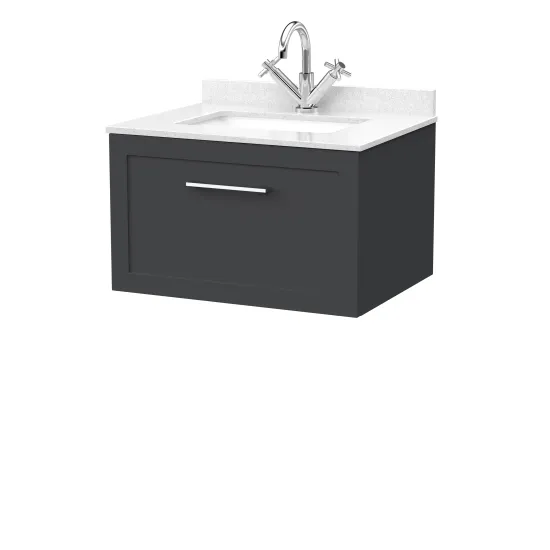 nuie Lux Larck 600mm Single Drawer Wall Hung Unit with Single Bowl Marble Top 1 Tap Hole in White - Pebble Grey