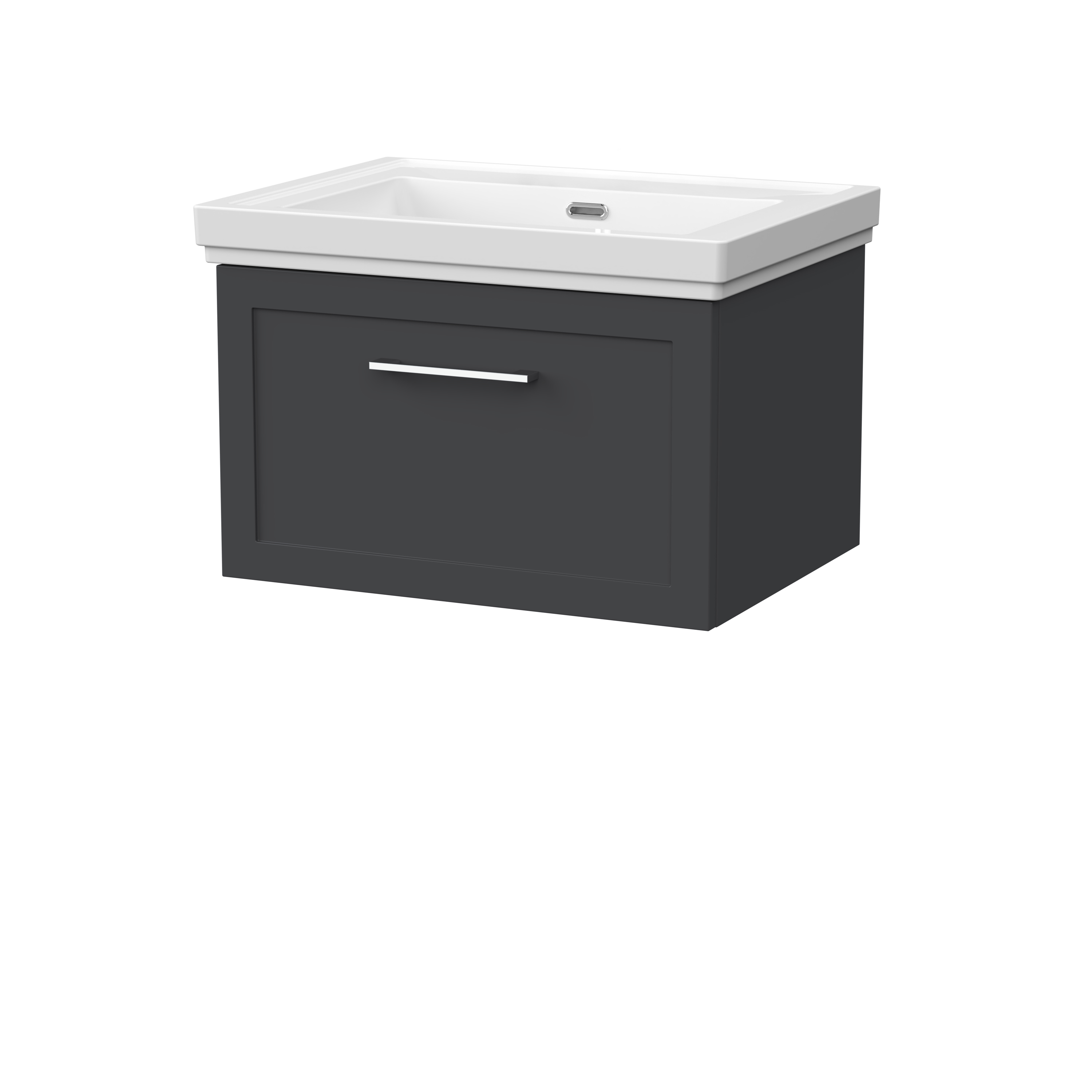nuie Lux Larck 600mm Single Drawer Wall Hung Unit with Traditional Fireclay Basin - 0 Tap Holes - Pebble Grey