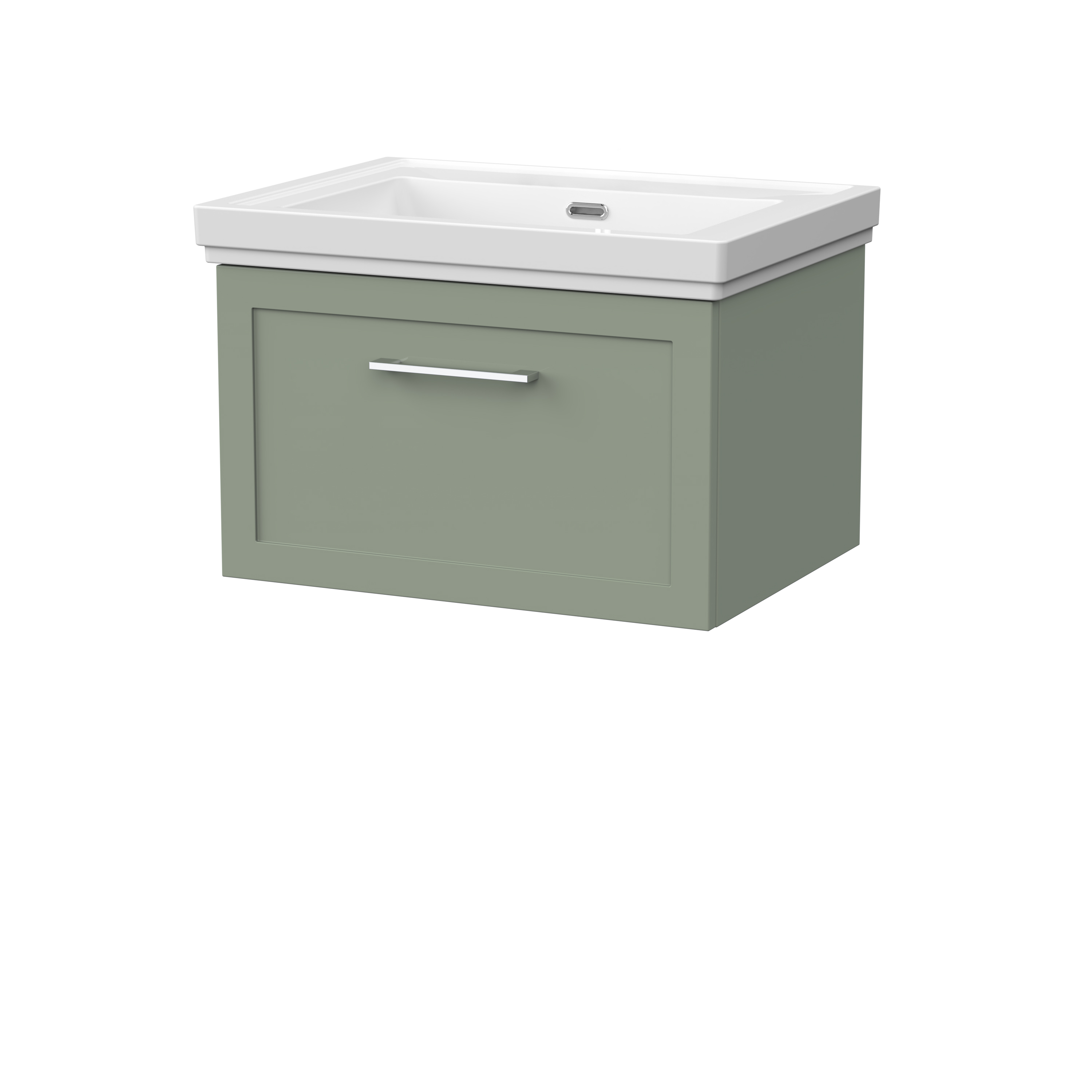 nuie Lux Larck 600mm Single Drawer Wall Hung Unit with Traditional Fireclay Basin - 0 Tap Holes - Fern Green