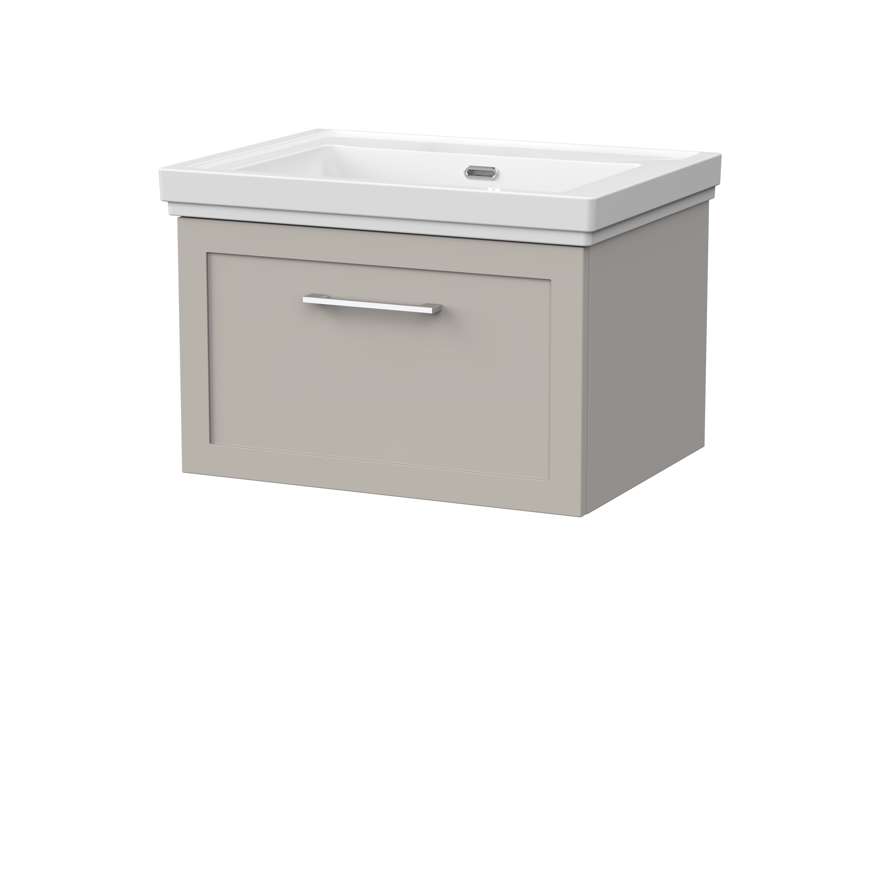 nuie Lux Larck 600mm Single Drawer Wall Hung Unit with Traditional Fireclay Basin - 0 Tap Holes - Pebble Grey