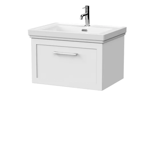 nuie Lux Larck 600mm Single Drawer Wall Hung Unit with Traditional Fireclay Basin - 1 Tap Hole - Matt White