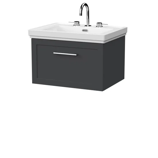nuie Lux Larck 600mm Single Drawer Wall Hung Unit with Traditional Fireclay Basin - 3 Tap Holes - Pebble Grey