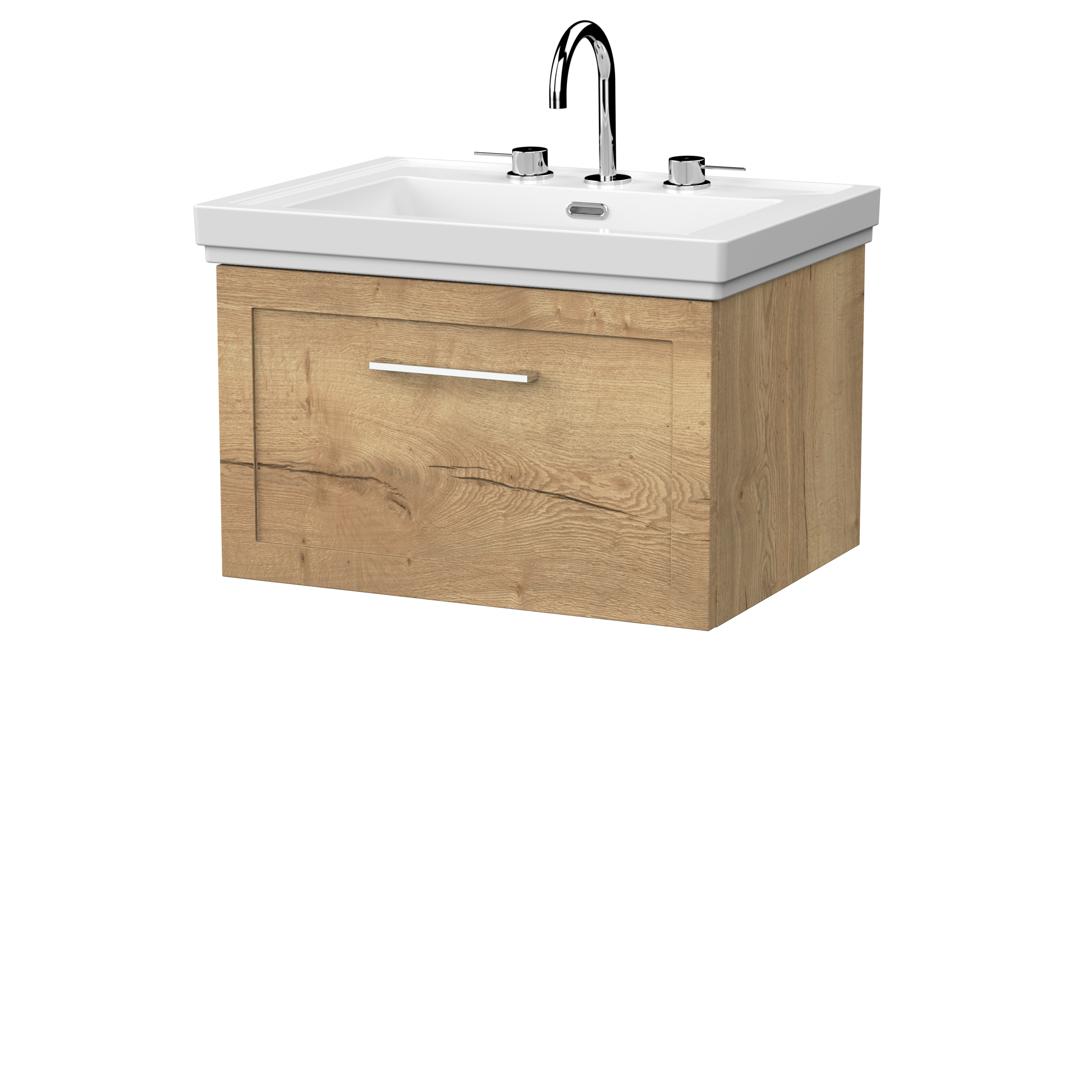 nuie Lux Larck 600mm Single Drawer Wall Hung Unit with Traditional Fireclay Basin - 3 Tap Holes - Autumn Oak