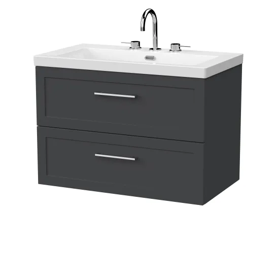 nuie Lux Larck 800mm 2- Drawer Wall Hung Unit with Contemporary Fireclay Basin - 3 Tap Holes - Soft Black