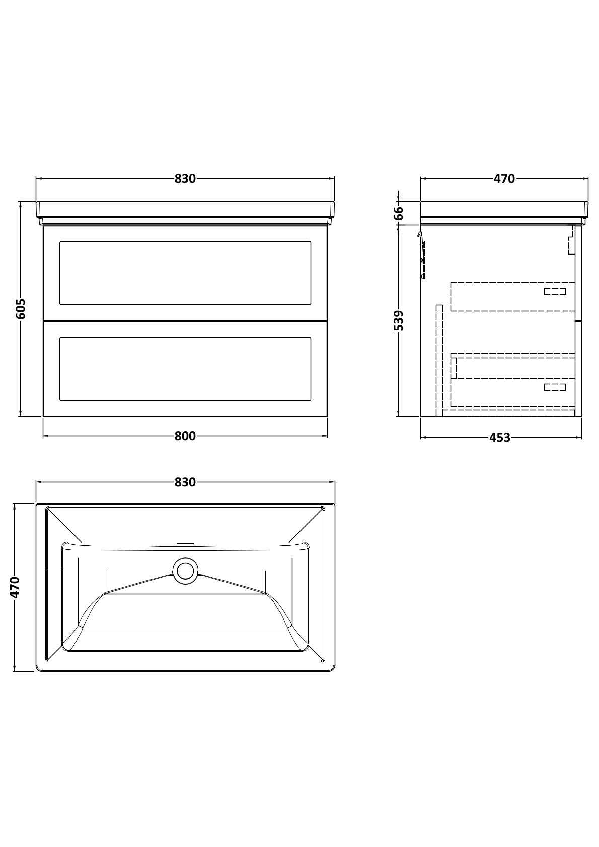 Larck 800mm 2- Drawer Wall Hung Unit with Traditional Fireclay Basin - 0 Tap Holes
