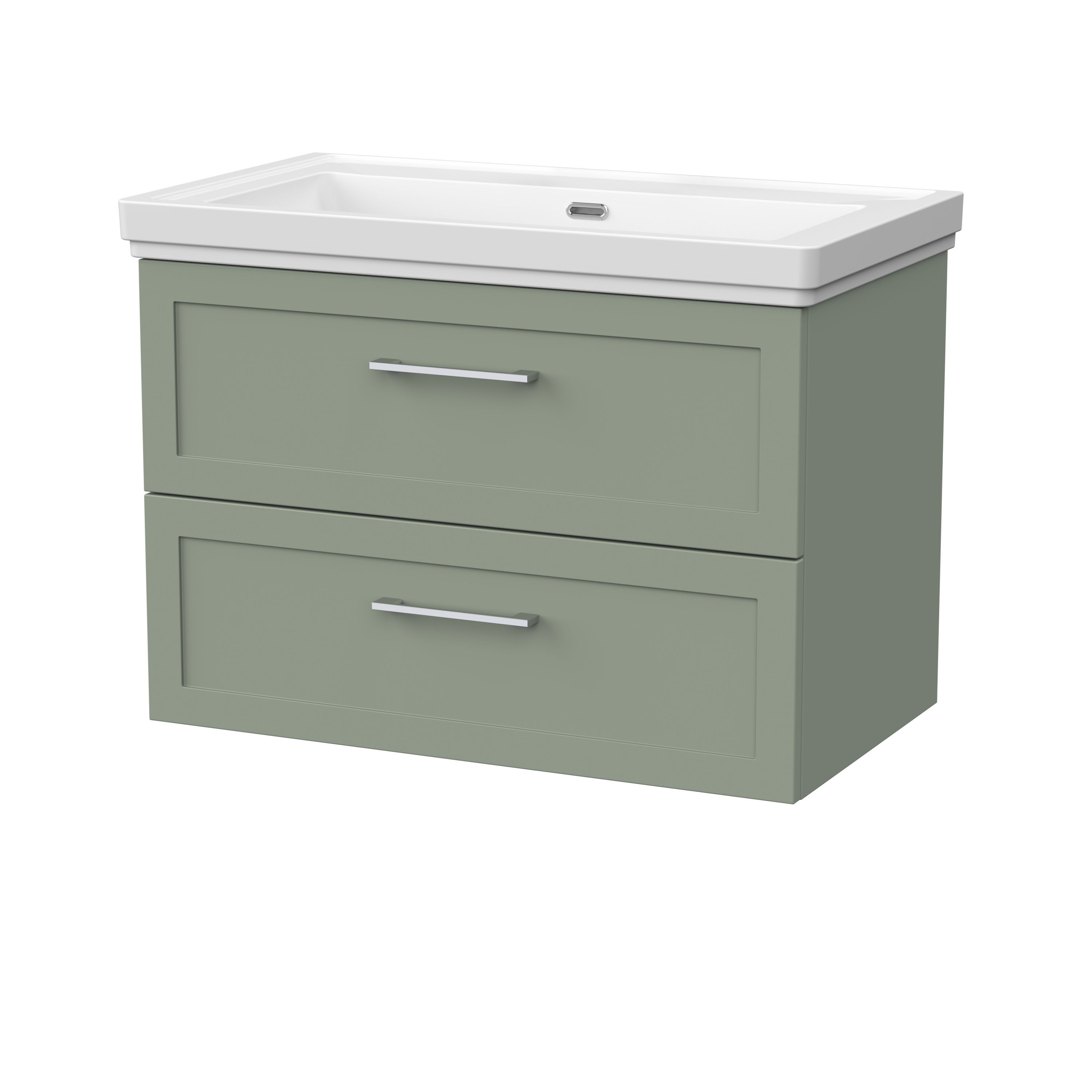 nuie Lux Larck 800mm 2- Drawer Wall Hung Unit with Traditional Fireclay Basin - 0 Tap Holes - Fern Green